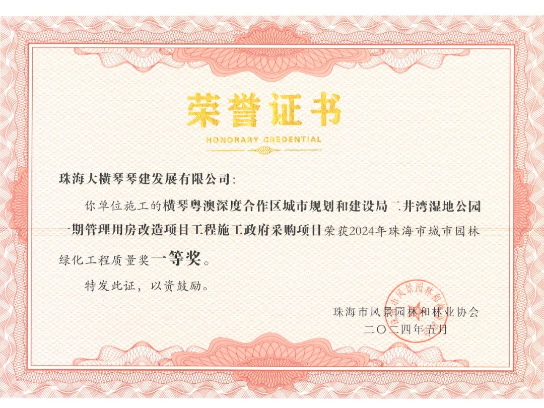 橫琴粵澳深度合作區(qū)城市規(guī)劃和建設局市政管理署2023年專類公園綜合管養(yǎng)政府采購項目、橫琴粵澳深度合作區(qū)城市規(guī)劃和建設局二井灣濕地公園一期管理用房改造項目工程施工政府采購項目,榮獲2024年珠海市城市園林綠化工程質(zhì)量獎一等獎!富山工業(yè)城B區(qū)展示區(qū)園林景觀提升工程,榮獲2024年珠海市城市園林綠化工程質(zhì)量獎二等獎!