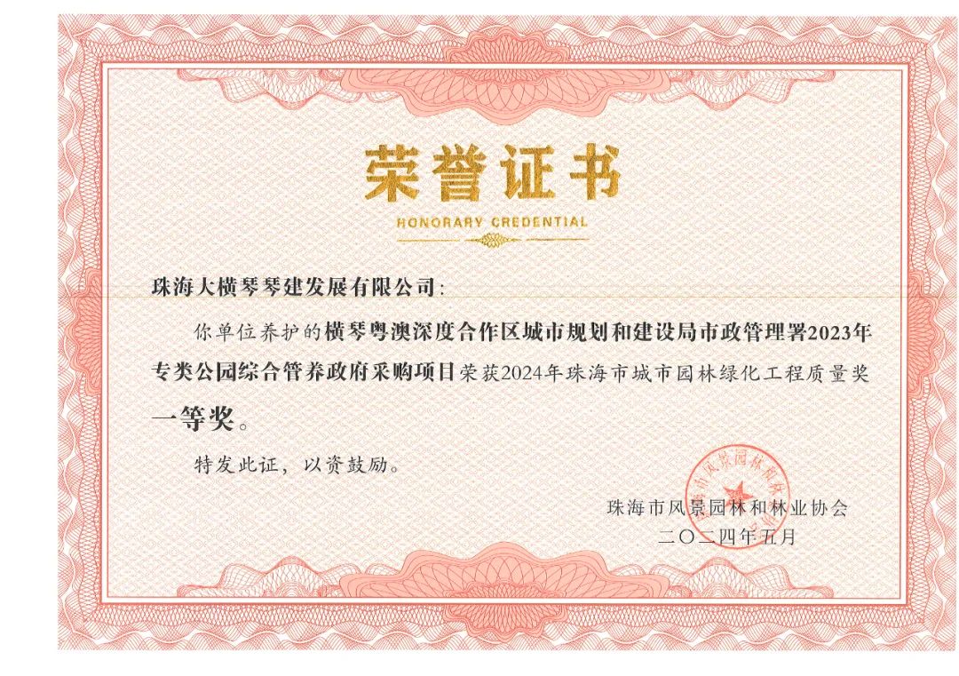 珠海市城市園林綠化工程質(zhì)量獎是本市園林綠化工程類的重要獎項,旨在提高景觀園林綠化建設的質(zhì)量和水平,評選出在全市具有引導和示范作用的景觀園林綠化優(yōu)秀工程及養(yǎng)護項目。本次獲獎,是珠海市風景園林和林業(yè)協(xié)會對大橫琴集團管養(yǎng)項目、施工項目與代建項目品質(zhì)的認可與鼓勵。同時也是大橫琴集團在貫徹落實市委、市政府關于“綠美珠海生態(tài)建設”工作部署中取得的階段性成效。