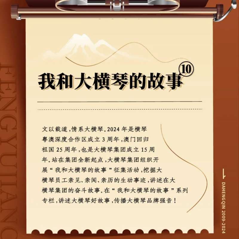 文以載道,情系大橫琴。2024年是橫琴粵澳深度合作區(qū)成立3周年,澳門(mén)回歸祖國(guó)25周年,也是大橫琴集團(tuán)成立15周年。站在集團(tuán)全新起點(diǎn),大橫琴集團(tuán)組織開(kāi)展“我和大橫琴的故事”征集活動(dòng),挖掘大橫琴員工親見(jiàn)、親聞、親歷的生動(dòng)事跡,講述在大橫琴集團(tuán)的奮斗故事。大橫琴集團(tuán)公眾號(hào)將陸續(xù)推出“我和大橫琴的故事”系列專(zhuān)欄,講述大橫琴好故事,傳播大橫琴品牌強(qiáng)音!